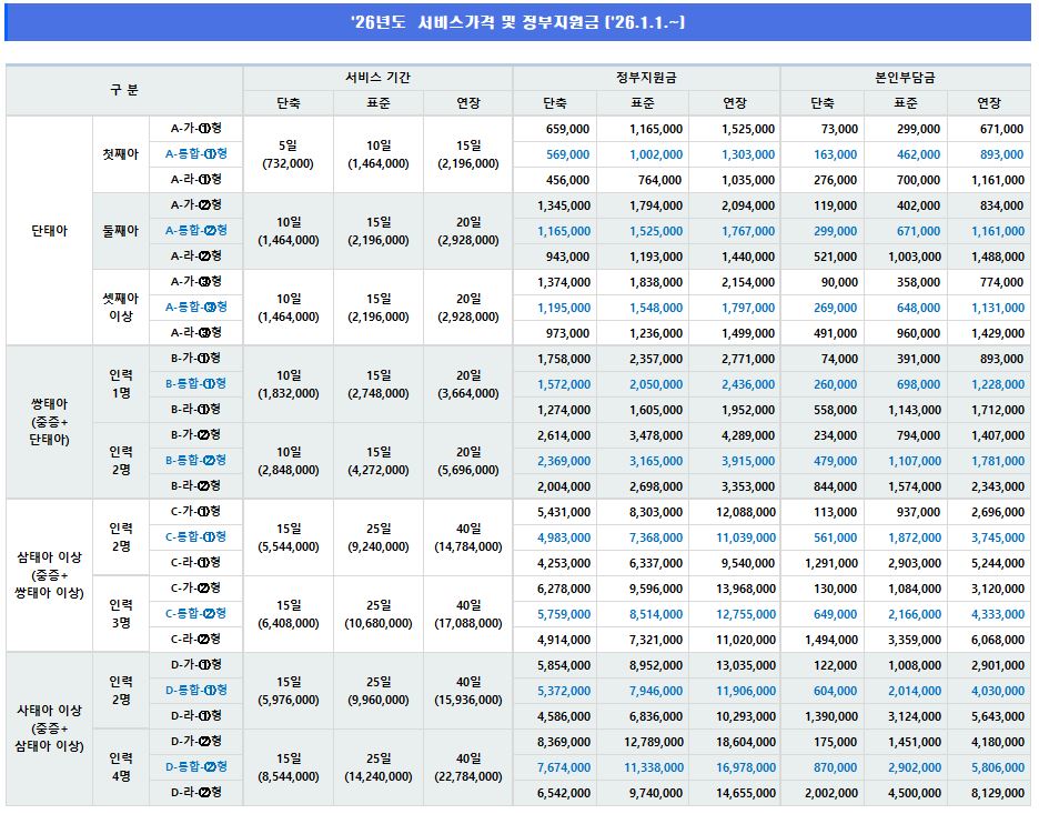 • 장애의 정도가 심한 장애인 산모의 경우 단태아 출산시 B형, 쌍태아 출산시 C형 적용, 삼태아 이상 출산시 D형 적용